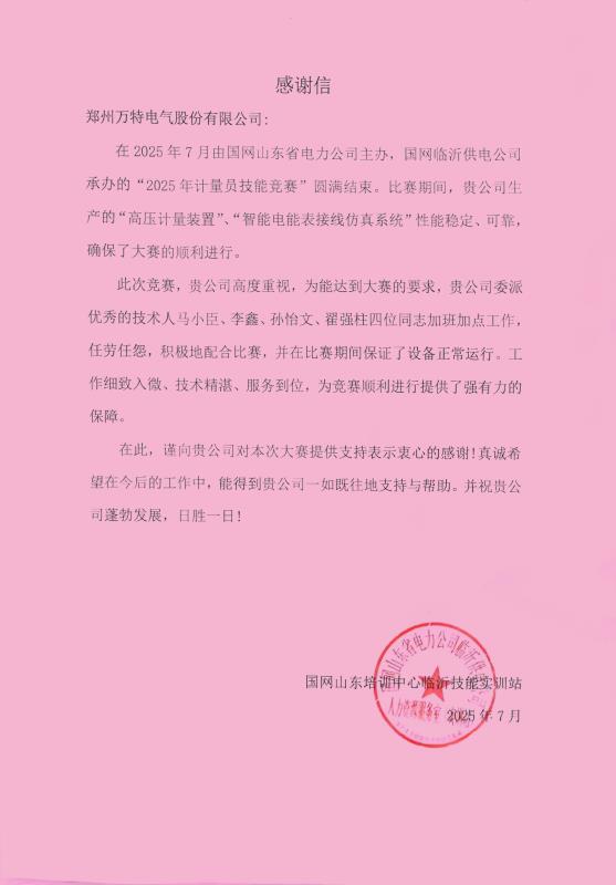 2025年7月,由國網(wǎng)山東省電力公司主辦、國網(wǎng)臨沂供電公司承辦的“2025年計(jì)量員技能競賽”在臨沂圓滿落幕。公司為本次競賽提供的競賽用產(chǎn)品憑借穩(wěn)定可靠的性能,保障了大賽的順利進(jìn)行,獲得主辦方高度評價。